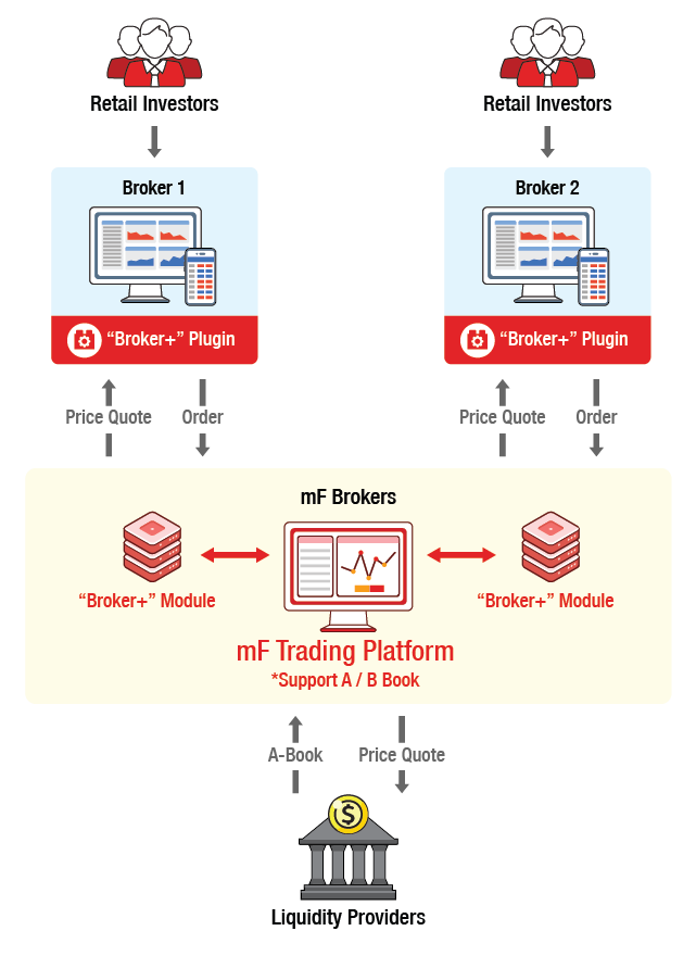 mF brokers can multiply their trading volume by mF trading system to transact the flow from other MT brokers directly via STP